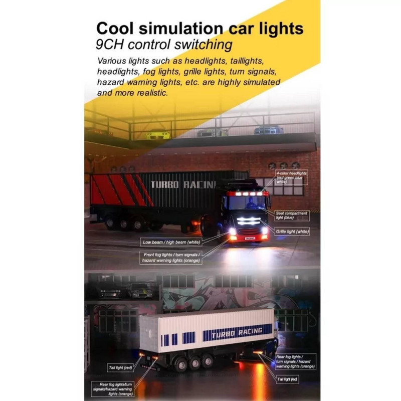 Il est possible de personnaliser la remorque selon votre souhait. A la manière d’une maquette, vous pouvez assembler le container avec des portes fonctionnelles ou installer les barrières fournies pour transporter vos voitures Turbo Racing sur la remorque du camion.