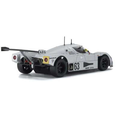 La carrosserie de la Sauber Mercedes C9 No.63 LM 1989 est reproduite avec un soin extrême, intégrant les couleurs officielles, les logos et les éléments aérodynamiques caractéristiques de la voiture d’endurance. Le spoiler arrière, les jantes et les détails du cockpit sont fidèlement recréés pour offrir un réalisme saisissant. La peinture de haute qualité et la finition brillante mettent en valeur le style emblématique de cette légende du Mans.